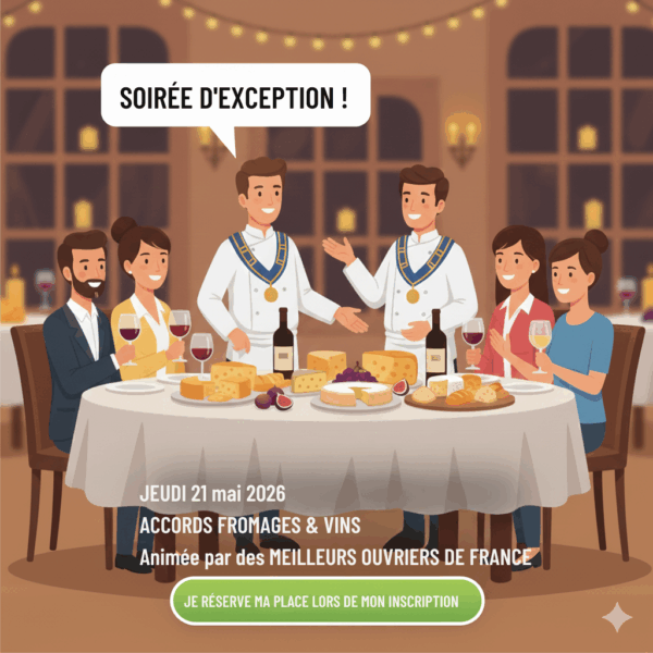 Rejoignez-nous pour notre soirée exclusive “Accords Fromages & Vins”, animée par des Meilleurs Ouvriers de France.